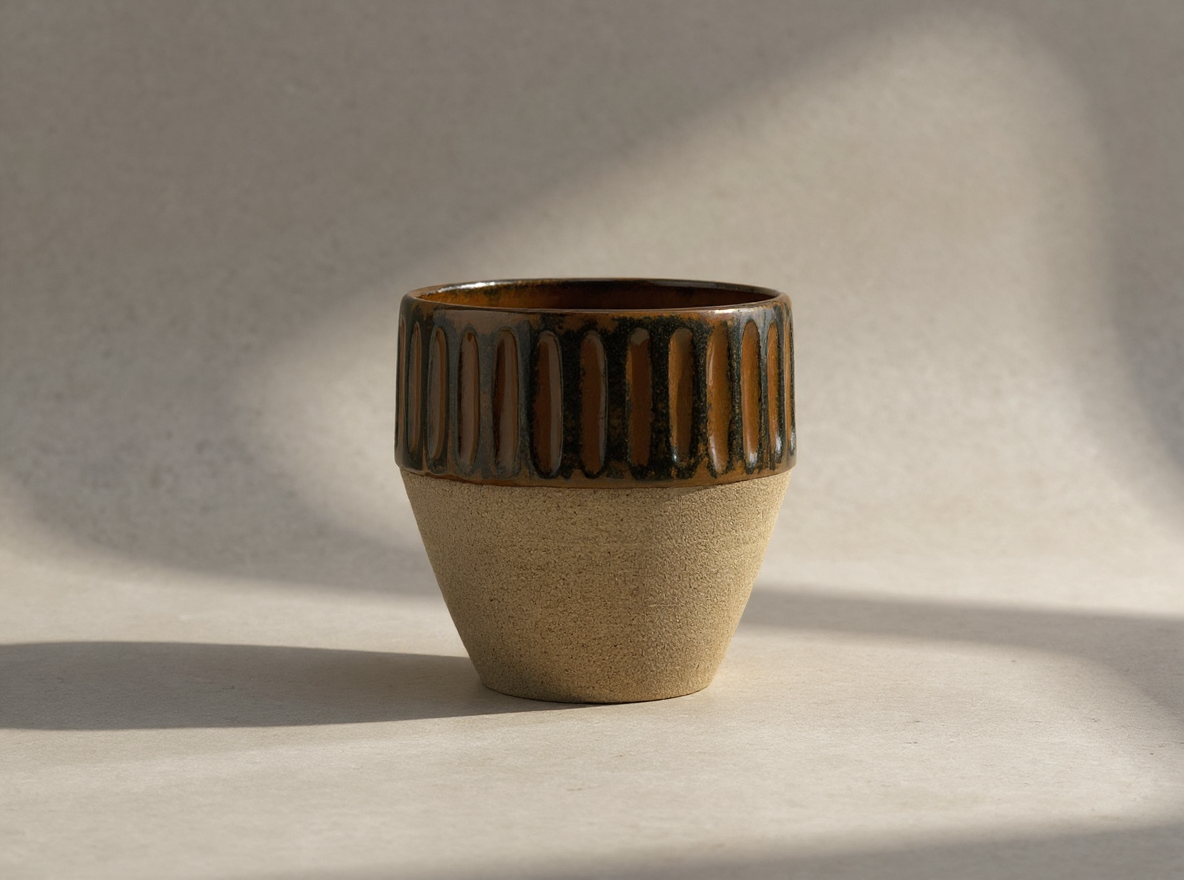 Bu zarif seramik bardak, hem estetiği hem de işlevselliği bir araya getiriyor. Üst kısmındaki sıraltı kahverengi ve yeşil tonlarıyla, dikey hatlı kabartmalı deseni el yapımı bir dokunuş katarken, alt kısmındaki taş dokulu, sırsız stoneware çamur ise doğal ve modern bir görünüm sağlıyor.