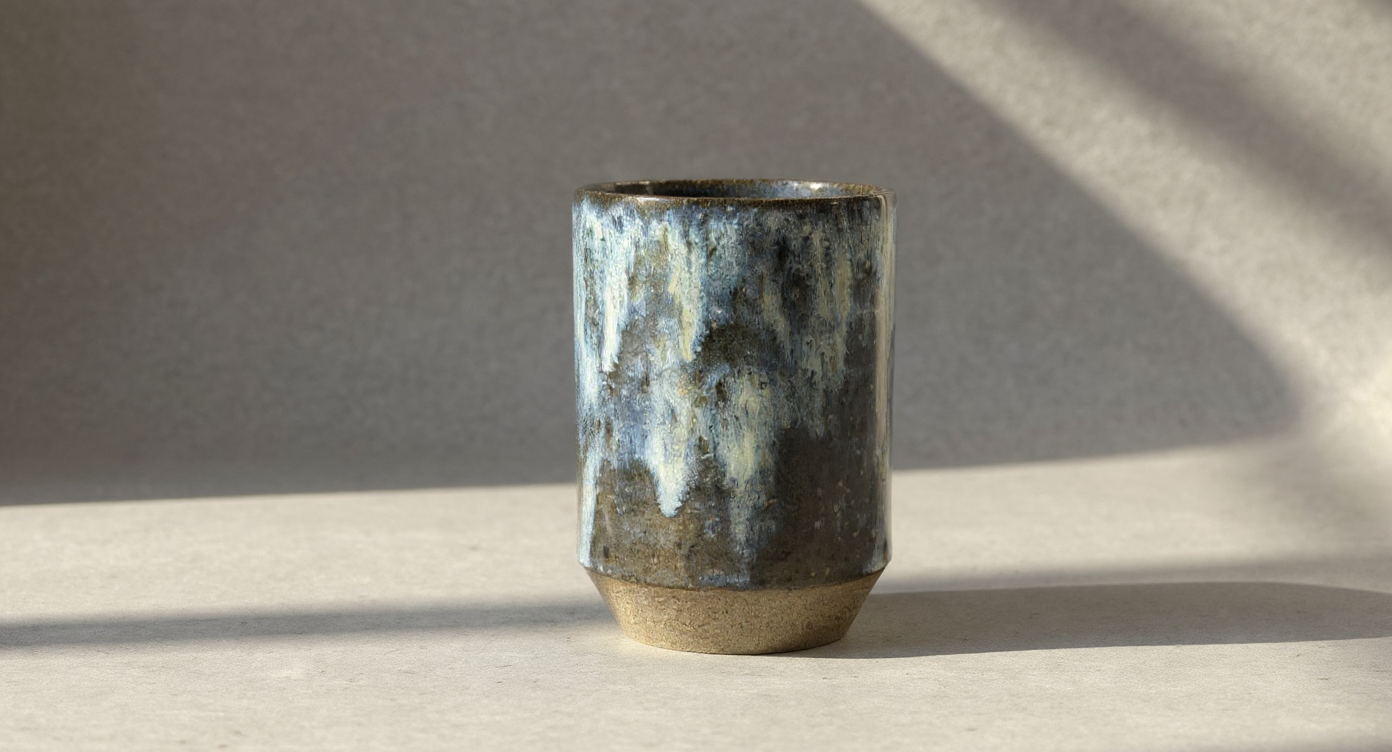 Bu el yapımı seramik vazo, doğanın ham güzelliğini ve sanatsal bir dokunuşu bir araya getiriyor. Üst kısmındaki reaktif sır, lacivert, kahverengi, sarı ve beyaz tonlarının akıcı bir şekilde iç içe geçmesiyle eşsiz bir desen oluşturuyor. Alt kısmındaki taş dokulu, sırsız stoneware çamur ise vazonun rustik ve doğal bir his vermesini sağlıyor.