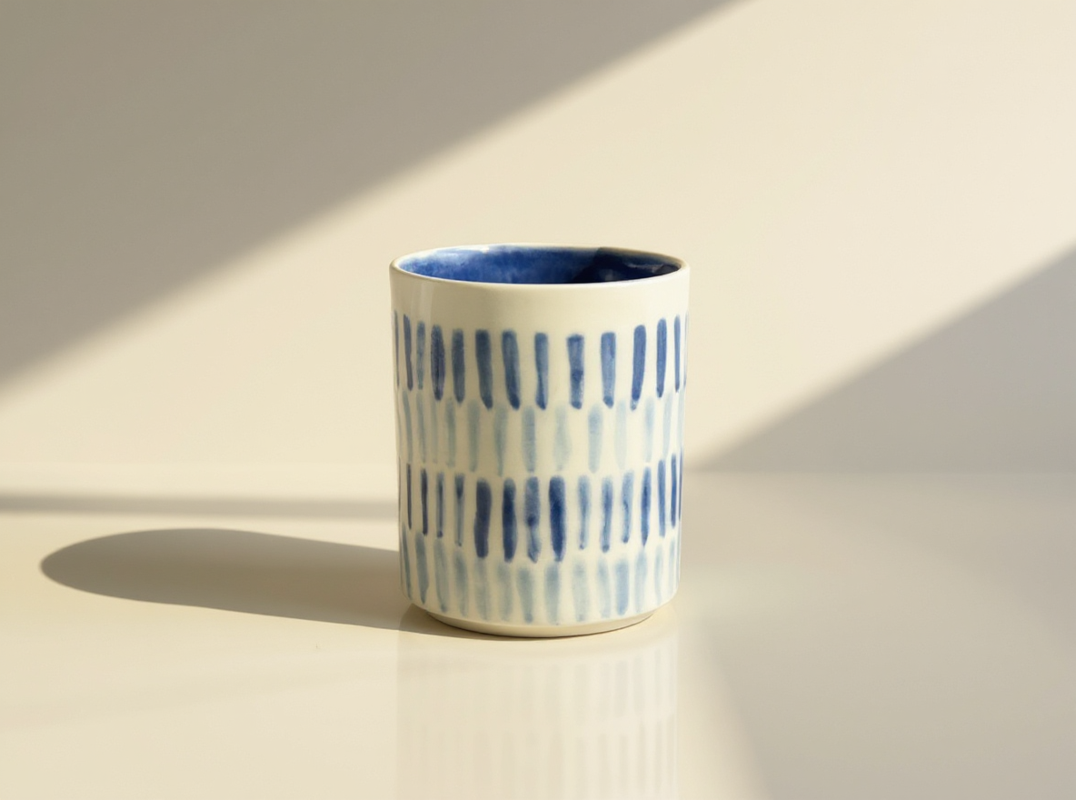 Bu el yapımı porselen bardak, neşeli ve modern bir tasarıma sahip.