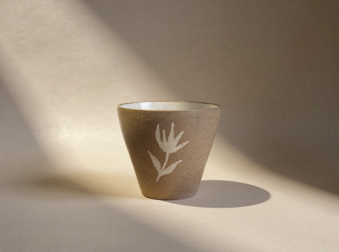Dış yüzeyindeki ham ve taş dokulu seramik üzerine, el çizimi beyaz bir çiçek motifi işlenmiştir.